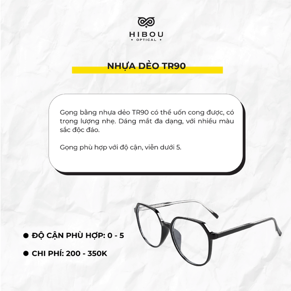 Có lẽ bạn đã quen thuộc với gọng nhựa và kim loại. Nhưng tại Hibou, chúng mình có phân loại chất liệu cụ thể hơn hẳn: nhựa dẻo TR90, thép không gỉ, titan, nhựa acetate... Mỗi chất liệu lại phù hợp với một nhu cầu sử dụng, độ cận khác nhau và cũng có giá khác nhau. Nếu bạn muốn chọn chất liệu phù hợp nhất với chi phí rẻ nhất, bạn hãy đọc bảng tóm tắt của Hibou. Và đến ngay cơ sở gần nhất để chọn gọng kính nhé!