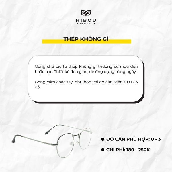 Đây là hợp kim của sắt và niken, mangan, crôm. Thép không gỉ trọng lượng nhẹ, không gây dị ứng và dễ dàng uốn cong. Chất liệu này chống sự ăn mòn hoàn hảo, chịu được nhiệt độ cao, trọng lượng nhẹ, không gây dị ứng nên là chất liệu tuyệt vời để làm gọng kính. Gọng thép không gỉ có nhiều màu sắc bắt mắt. Nếu có độ cận từ 0 - 5 độ, bạn có thể yên tâm sử dụng gọng này.