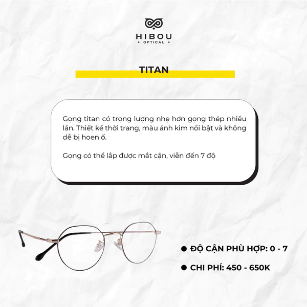 Titan là kim loại cao cấp để làm gọng kính cũng như các loại trang sức như dây chuyền, vòng tay,... Titan có ba loại: Titanium, Titanium Z và Excellence Titan. Gọng kính từ titan khá đắt và ít mẫu mã nhưng bù lại nó không gây dị ứng, có độ đàn hồi, không bị gỉ, bền đẹp và rất nhẹ. Gọng titan có độ bền cao phù hợp lắp mắt cận nặng đến tận 8 độ. Với mắt cận trên 8, bạn nên lưu ý lựa chọn gọng titan có thiết kế viền sâu để tránh lộ mắt dày.