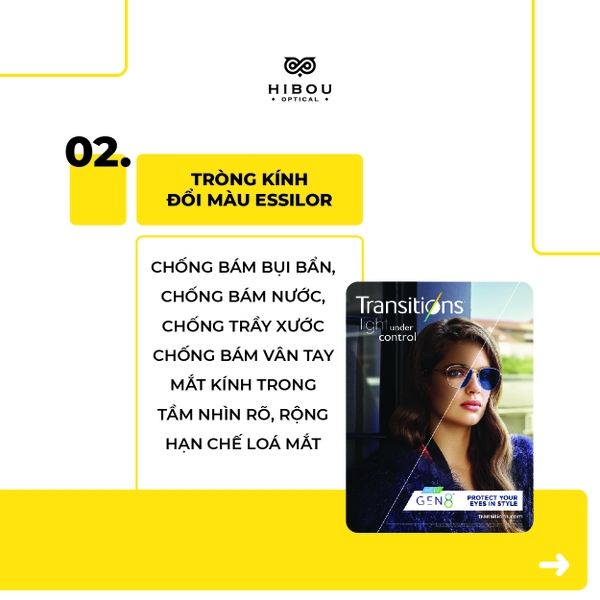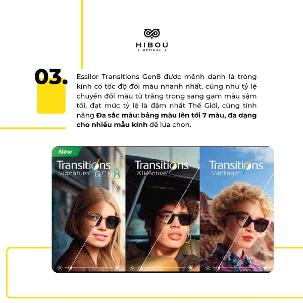 Tròng Essilor Transition Gen 8 có những cải tiến mới giúp bảo vệ mắt tốt nhất khỏi tia UV và ánh sáng xanh có hại. Đặc biệt, tròng có khả năng tối ưu độ đậm màu theo điều kiện ánh sáng cho tầm nhìn rõ nét và dễ chịu nhất.