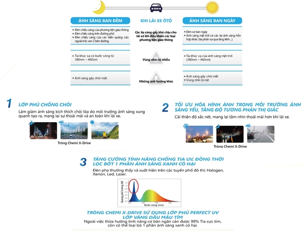 TRÒNG KÍNH CHÍNH HÃNG CHEMI X-DRIVE 1.60 sẽ làm giảm thiểu sự phân tán ánh sáng chiếu rọi vào mắt và loại bỏ tia ánh sáng xanh có hại cho mắt. Nhờ vậy, người đeo sẽ có một tầm nhìn rõ rệt, đảm bảo an toàn khi lái xe máy hoặc ô tô.